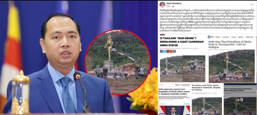 ភ្នំពេញ)៖ លោក នេត្រ ភក្ត្រា រដ្ឋមន្ត្រីក្រសួងព័ត៌មាន នៅថ្ងៃទី២៥ ខែធ្នូ ឆ្នាំ២០២៥នេះ បានថ្លែងថា សារព័ត៌មាននានាជាពិសេសសារព័ត៌មាននៅក្នុងប្រទេសឥណ្ឌាបានផ្សព្វផ្សាយពីរូបភាពដែលយោធាថៃក្រោយការឈ្លានពានលើទឹកដីកម្ពុជា បានបំផ្លាញរូបសំណាកព្រះវិស្ណុដែលបានសាងសង់នៅលើទឹកដីកម្ពុជាសម្រាប់ការគោរពបូជា។