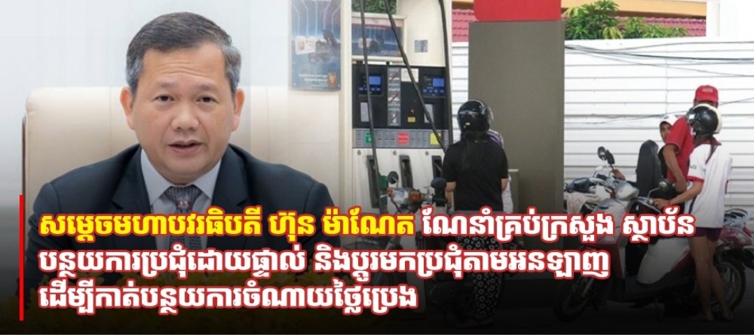 (ភ្នំពេញ)៖ សម្ដេចមហាបវរធិបតី ហ៊ុន ម៉ាណែត នាយករដ្ឋមន្ដ្រីនៃកម្ពុជា បានណែនាំដល់គ្រប់បណ្ដាក្រសួង ស្ថាប័នទាំងអស់ ត្រូវកាត់បន្ថយការប្រជុំដោយផ្ទាល់ និងត្រូវប្ដូរមកប្រជុំតាមប្រព័ន្ធអនឡាញ ដើម្បីកាត់បន្ថយការចំណាយថ្លៃប្រេង និងកាត់បន្ថយការប្រើប្រាស់ប្រេងឥន្ធនៈចំពោះមធ្យោបាយធ្វើដំណើរ លើកលែងករណីចាំបាច់។
