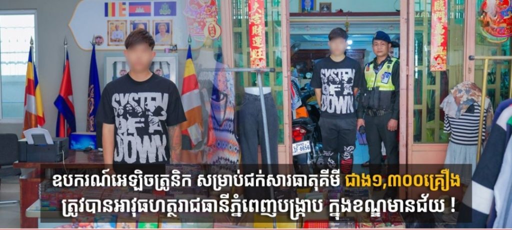 (ភ្នំពេញ)៖ ដោយមានការសហការ ផ្ដល់ព័ត៌មានពីប្រជាពលរដ្ឋតាមរយៈផេកហ្វេសប៊ុក របស់កងរាជអាវុធហត្ថរាជធានីភ្នំពេញ ដែលមានឈ្មោះថា Phnom Penh Gendarmerie នៅវេលាម៉ោង១៤៖៣០នាទី ថ្ងៃទី៣១ ខែមីនា ឆ្នាំ២០២៦ កម្លាំងអាវុធហត្ថរាជធានីភ្នំពេញ សហការជាមួយកម្លាំងមូលដ្ឋានអាវុធហត្ថខណ្ឌមានជ័យ បានចុះបង្ក្រាបទីតាំង លួចលក់ឧបករណ៍អេឡិចត្រូនិកសម្រាប់ជក់សារធាតុគីមី ១កន្លែង នៅចំណុចហាងលក់ខោអាវជជុះក្បាលគីបនារី ផ្លូវប៉េតុង ភូមិមានជ័យ សង្កាត់ស្ទឹងមានជ័យទី១ ខណ្ឌមានជ័យ រាជធានីភ្នំពេញ និងបានចាប់យកវត្ថុតាងចម្រុះ ប្រមាណជាង ១,៣០០គ្រឿង ឃាត់ខ្លួនម្ចាស់ទីតាំង ០១នាក់ នាំយកទៅអង្គភាព ដើម្បីចាត់ការតាមនីតិវិធីច្បាប់។