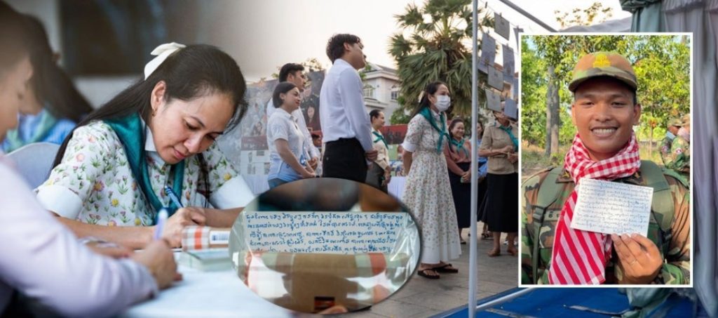 (ភ្នំពេញ)៖ ក្រុមយុវជនមួយក្រុមកាលពីពេលថ្មីៗនេះ បានរៀបចំកម្មវិធីទទួលក្រមា និងសរសេរសារជូនពរផ្ញើទៅកាន់កងទ័ពជួរមុខមុខ។ លោកជំទាវបណ្ឌិត ពេជ ចន្ទមុន្នី ភរិយាសម្តេចមហាបវរធិបតី ហ៊ុន ម៉ាណែត ក៏បានចូលរួមសរសេរសារជូនទៅកងទ័ពជួរមុខផងដែរ។