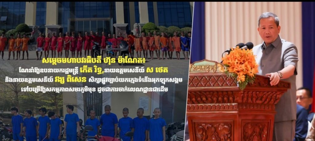 សម្តេចបវរធិបតី ហ៊ុន ម៉ាណែត បានបន្តថា នៅពេលអនុវត្តច្បាប់ ដោយទទួលការអប់រំ របស់សមត្ថកិច្ចចំពោះក្មេងទំនើង ដូច្នេះ ចៀសជាងដាក់នៅពន្ធនាគារអត់ធ្វើអី។ ត្រង់ចំណុចនេះនៅក្នុងដំណាក់កាលគ្រប់គ្រងពិសេសរបស់មន្ត្រីនគរបាលកន្លែងណាមួយសម្រាប់បម្រើការងារឱ្យសមរភូមិមុខ។