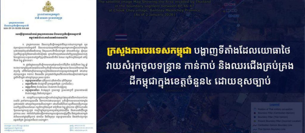 រាជរដ្ឋាភិបាលកម្ពុជាសូមសង្កត់ធ្ងន់ថា ការបន្តឈរជើង និងកាន់កាប់ជាក់ស្តែងដោយកងកម្លាំងយោធាថៃលើទឹកដីកម្ពុជា ដែលនៅតំបន់ខ្លះគឺហួសពីខ្សែបន្ទាត់ព្រំដែនតាមជំហថៃទៅទៀត គឺជាការបន្តកាន់កាប់ដោយខុសច្បាប់ និងគ្មានមូលដ្ឋានទាល់តែសោះក្រោមច្បាប់អន្តរជាតិ។ ការកាន់កាប់ និងបន្តកាន់កាប់ តាមរយៈការគំរាមកំហែង និងការប្រើប្រាស់កម្លាំងនេះ គឺផ្ទុយទៅនឹងគោលការណ៍ជាមូលដ្ឋាន និងមិនអាចបដិសេធបាននៃច្បាប់អន្តរជាតិ ដែលហាមឃាត់ការកាន់កាប់យកទឹកដីដោយប្រើប្រាស់កម្លាំង។ ការកាន់កាប់ទឹកដី ដែលទទួលបានពីការគំរាមកំហែង និងប្រើប្រាស់កម្លាំង គឺផ្ទុយទៅនឹងគោលការណ៍ជាមូលដ្ឋាន និងដាច់ខាតនៃច្បាប់អន្តរជាតិ ដែលហាមឃាត់នូវការដណ្តើមយកទឹកដីដោយប្រើប្រាស់កម្លាំង។ ការគ្រប់គ្រងទឹកដី សកម្មភាពរដ្ឋបាល ឬការអនុវត្តសិទ្ធិអំណាចដែលកើតចេញពីទង្វើបែបនេះ គឺគ្មានតម្លៃតាមផ្លូវច្បាប់ និងមិនអាចបង្កើតសិទ្ធិស្របច្បាប់ណាមួយបានឡើយ៕