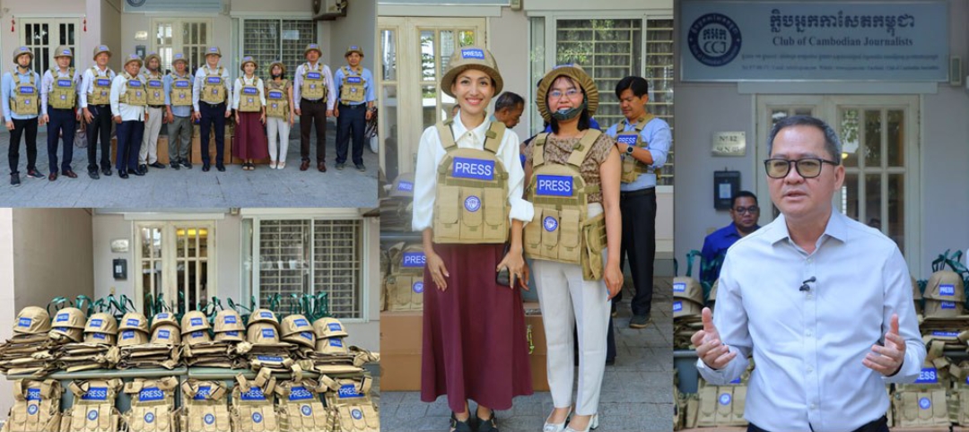 ភ្នំពេញ)៖ ក្លិបអ្នកកាសែតកម្ពុជា (ក.អ.ក) នៅថ្ងៃទី៥ ខែមករា ឆ្នាំ២០២៦ បានចែកអាវក្រោះ និងមួកសុវត្ថិភាពជាលើកទី២ ដល់អ្នកសារព័ត៌មានចំនួន ២១រូប មកពី ២០ស្ថាប័ន ដើម្បីលើកទឹកចិត្ត និងគាំទ្រការធ្វើសេចក្តីរាយការណ៍ បទយកការណ៍ និងផ្សព្វផ្សាយព័ត៌មានពិតជាច្រើនទាក់ទងនឹងការវាយប្រហាររបស់យោធាថៃមកលើកម្ពុជា នៅតាមតំបន់ព្រំដែន។