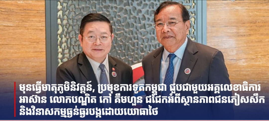 ម៉ាឡេស៊ី)៖ មុននឹងអញ្ជើញមាតុភូមិនិវត្តន៍វិញ លោកឧបនាយករដ្ឋមន្ត្រី ប្រាក់ សុខុន រដ្ឋមន្ត្រីការបរទេស និងសហប្រតិបត្តិការអន្តរជាតិ នៅរសៀលថ្ងៃទី២២ ខែធ្នូ ឆ្នាំ២០២៥នេះ បានជួបពិភាក្សាការងារជាមួយ លោកបណ្ឌិត កៅ គឹមហួន អគ្គលេខាធិការអាស៊ាន អំឡុងពេលនៃការចូលរួមកិច្ចប្រជុំពិសេសរដ្ឋមន្ត្រីការបរទេសអាស៊ាន ស្តីពីស្ថានភាពបច្ចុប្បន្នរវាងកម្ពុជា និងថៃ នៅទីក្រុងគូឡាឡាំពួ ប្រទេសម៉ាឡេស៊ី។