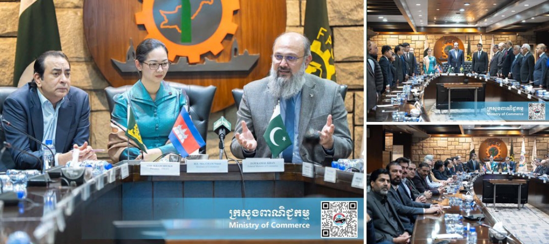 (អ៊ីស្លាម៉ាបាដ, ប៉ាគីស្ថាន)៖ ក្នុងឱកាសជួបពិភាក្សាការងារជាមួយសហព័ន្ធសភាពាណិជ្ជកម្ម និងឧស្សាហកម្មប៉ាគីស្ថាន រដ្ឋមន្រ្តីពាណិជ្ជកម្មកម្ពុជា និងរដ្ឋមន្រ្តីពាណិជ្ជកម្មប៉ាគីស្ថាន បានឯកភាពជំរុញទំនាក់ទំនងពាណិជ្ជកម្ម និងការវិនិយោគរវាងប្រទេសទាំងពីរឱ្យកាន់តែមានការរីកចម្រើនឡើងបន្ថែមទៀត។