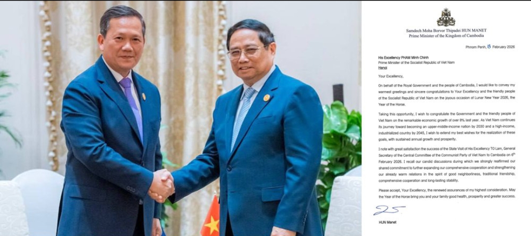 (ភ្នំពេញ)៖ សម្តេចបវរធិបតី ហ៊ុន ម៉ាណែត នាយករដ្ឋមន្ត្រីនៃកម្ពុជា បានផ្ញើសារលិខិតជូនពរលោក ផាម មិញជីញ នាយករដ្ឋមន្ត្រី នៃសាធារណរដ្ឋសង្គមនិយមវៀតណាម ក្នុងឱកាសបុណ្យចូលឆ្នាំថ្មីប្រពៃណីវៀតណាម ឆ្នាំ២០២៦។