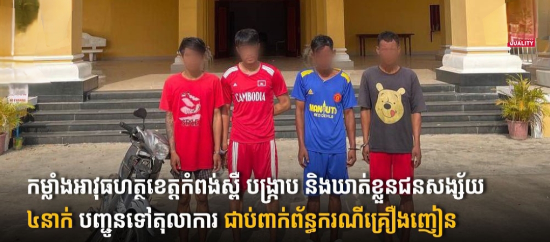 (កំពង់ស្ពឺ)៖ ក្រោមការដឹកនាំបញ្ជាដោយផ្ទាល់យ៉ាងម៉ឺងម៉ាត់របស់លោកឧត្តមសេនីយ៍ត្រី ម៉េង ស្រ៊ុន មេបញ្ជាការកងរាជអាវុធហត្ថខេត្តកំពង់ស្ពឺ ក្រោមការសម្របសម្រួលនីតិវិធីពីព្រះរាជអាជ្ញាអមសាលាដំបូងខេត្តកំពង់ស្ពឺ កាលពីវេលាម៉ោង ១៣៖១០នាទីនាថ្ងៃទី១៣ ខែកុម្ភៈ ឆ្នាំ២០២៦ កម្លាំងជំនាញកម្លាំងមន្ទីរស្រាវជ្រាវ និងបង្ក្រាបបទល្មើស សហការជាមួយកម្លាំងមូលដ្ឋានកងរាជអាវុធហត្ថស្រុកសំរោងទង ដឹកនាំដោយលោកវរសេនីយ៍ត្រី ទឹម ស៊ី នាយការិយាល័យប្រឆាំងគ្រឿងញៀន បានឆ្មក់បង្រ្កាបជាក់ស្ដែងនូវករណីគ្រឿងញៀន និងបានឃាត់ខ្លួនជនសង្ស័យបានចំនួន០៤នាក់ ស្ថិតនៅចំណុចរោងចាំស្រែមួយកន្លែង ក្នុងភូមិក្រាំងស្វាយ ឃុំរលាំងគ្រើល ស្រុកសំរោងទង ខេត្តកំពង់ស្ពឺ។