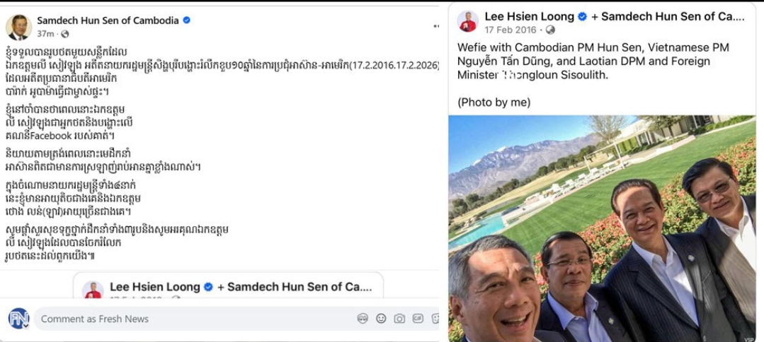 សម្តេចតេជោ ហ៊ុន សែន បានបង្ហោះរូបថត អមដោយខ្លឹមសារទាំងស្រុងដូច្នេះថា៖ «ខ្ញុំទទួលបានរូបថតមួយសន្លឹក ដែលឯកឧត្តម លី សៀវឡុង អតីតនាយករដ្ឋមន្ត្រីសង្ហបុរី បង្ហោះរំលឹកខួប ១០ឆ្នាំនៃការប្រជុំអាស៊ាន-អាមេរិក (17.2.2016.17.2.2026) ដែលអតីតប្រធានាធិបតីអាមេរិក បារ៉ាក់ អូបាម៉ា ធ្វើជាម្ចាស់ផ្ទះ។ ខ្ញុំនៅចាំបានថាពេលនោះឯកឧត្តម លី សៀវឡុង ជាអ្នកថតនិងបង្ហោះលើគណនី Facebook របស់គាត់។