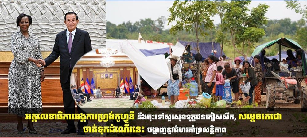 សម្តេចតេជោ ហ៊ុន សែន បានថ្លែងអំណរគុណចំពោះការចាប់អារម្មណ៍របស់លោកស្រីអគ្គលេខាធិការ ជាពិសេសការគ្រោងទៅសួរសុខទុក្ខជនភៀសសឹករបស់កម្ពុជា។ សម្តេចតេជោ ចាត់ទុកដំណើរទៅសួរសុខទុក្ខជនភៀសសឹក ជាការបង្ហាញច្បាស់នូវជំហររបស់លោកស្រីអគ្គលេខាធិការគាំទ្រដល់សន្តិភាព ហើយមិនចង់ឃើញការកើតឡើងនូវភ្លើងសង្គ្រាម។